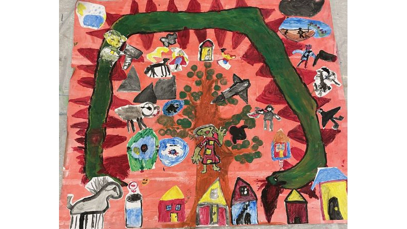 Barnen målar egna målningar där de får chansen att visualisera det de lärt sig, och vi använder collageteknik för att infoga varje barns målning i den stora, gemensamma bilden. Detta möjliggör ett otroligt flexibelt skapande, där alla får vara med men ändå ha chans att fördjupa sig i sitt egna skapande.