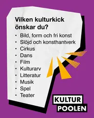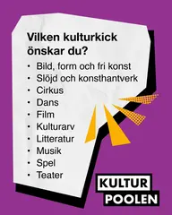 På den här sidan hittar du färdigt material för marknadsföring av Kulturpoolen. Materialet kan användas av kulturaktörer och kommuner i sina egna kanaler. Ladda gärna ner det du behöver och använd i din kommunikation.