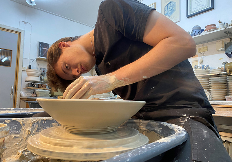Adeptern Ville och hans mentor Lennart har träffat och arbetat tillsammans under hela 2023. Några av de saker han har fördjupat sig i är dreja större vaser, vida fat och att blanda egna glasyrer. Mellan träffarna har han övat hemma i sin egen verkstad i Forshaga.
