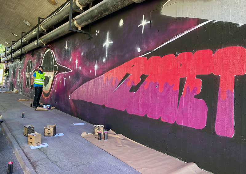 Järnvägstunneln i Kil smyckas med ett graffitikonstverk tack vare kultursommarjobbarna.