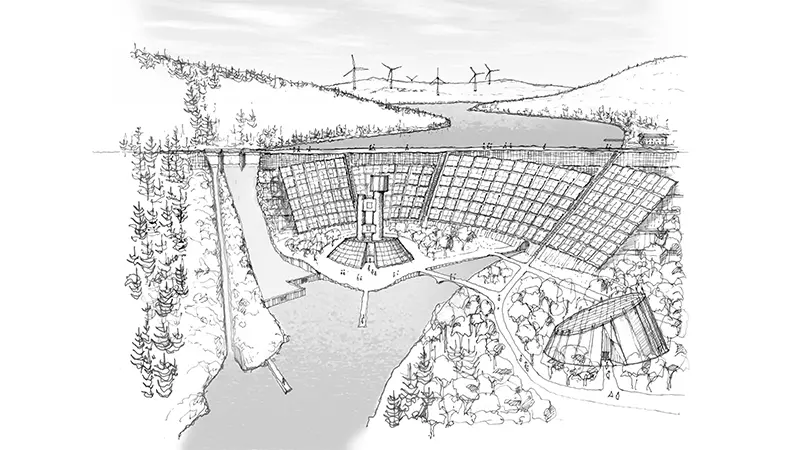 Vision av Höljes kraftverk 2043. Den nya energiparken runt Höljesdammen fungerar som en regulator för en stor del av den värmländska energiförsörjningen. Här har det växt upp både vindkraft och solkraft som kan regleras upp med hjälp av den viktiga vattenkraften. Illustration: Johannes Tovatt och Christophe Ginguené, SWECO Architects.