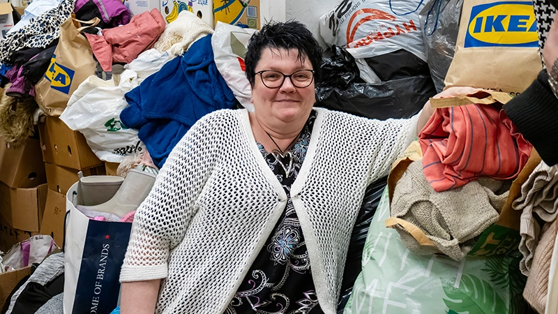 I personalutrymmet finns flera rum för olika arbetsuppgifter. 'Här finns något som passar alla', säger Gun, mitt i en hög av kläder som ska sorteras.