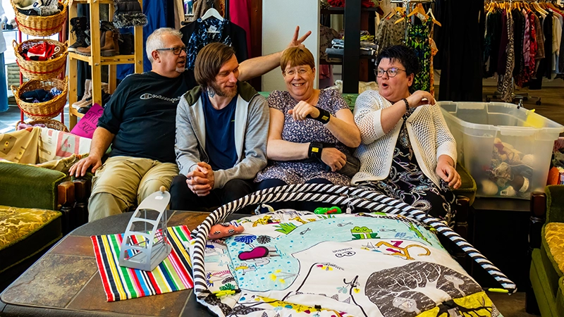 Det är en solig fredagseftermiddag när vi träffar de fyra kooperatörerna i en av deras verksamheter, secondhandbutiken i Charlottenberg. Gun, Bosse, Patrik och Karin har samlats i cafédelen. Än har de inte smält att de är årets vinnare av folkhälsopriset.