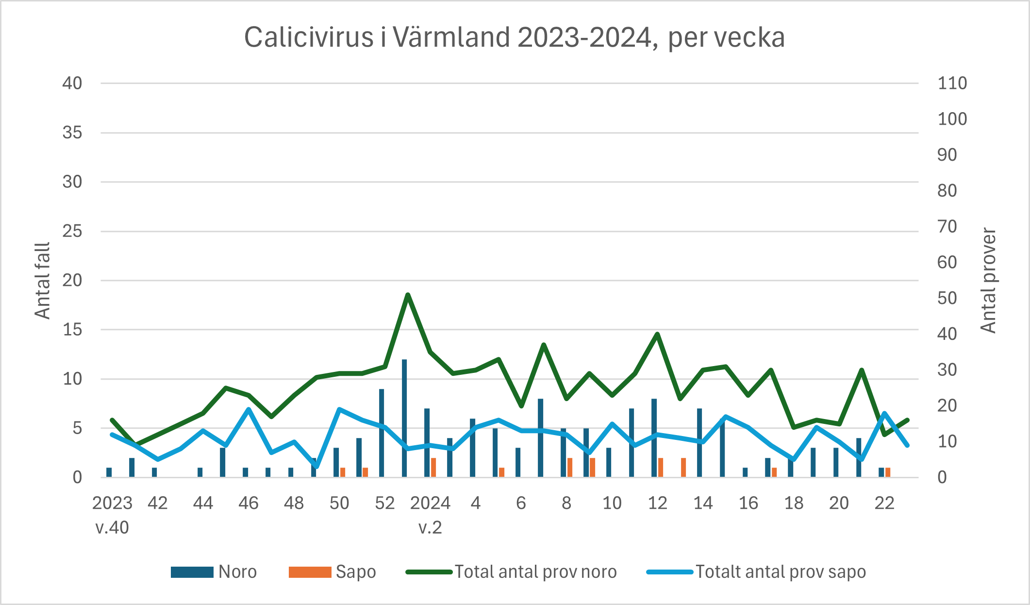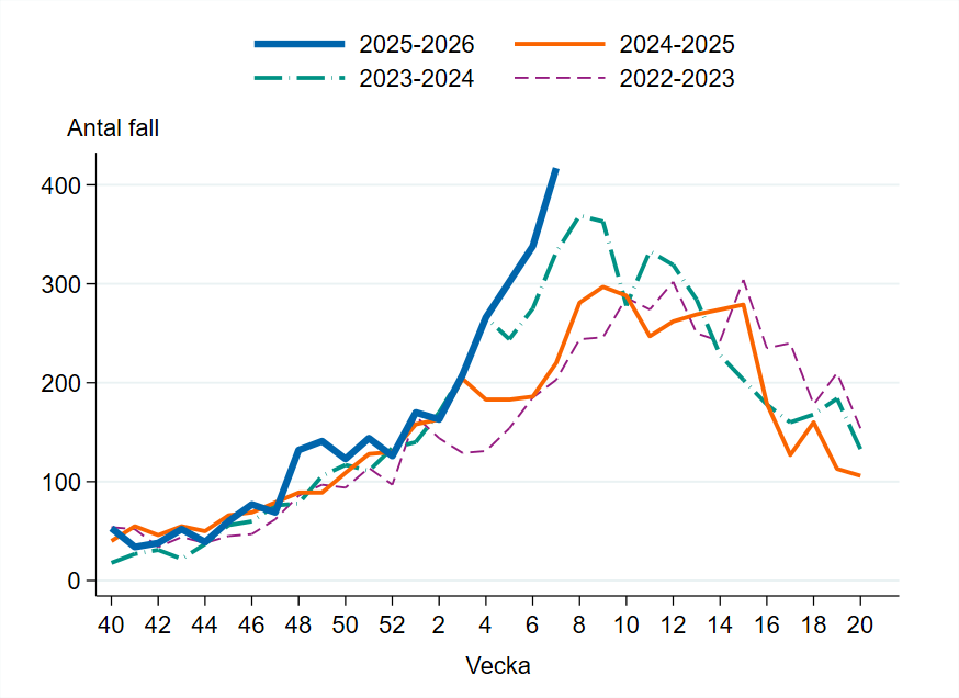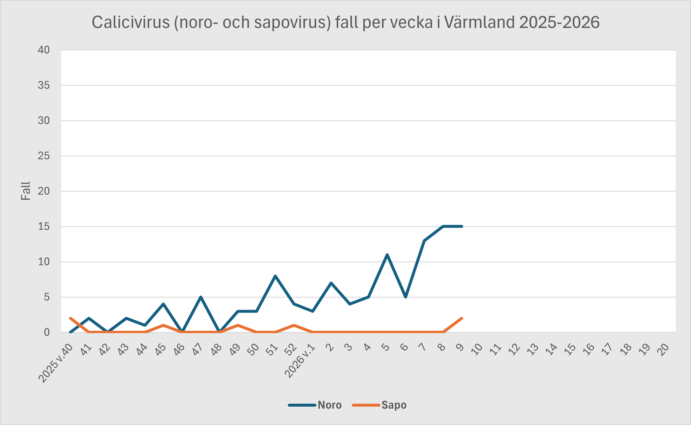 Antal fall av calicivirus (noro- och sapovirus) i Region Värmland per vecka under säsongen 2022-2023, 2023-2024, 2024-2025 och 2025-2026.