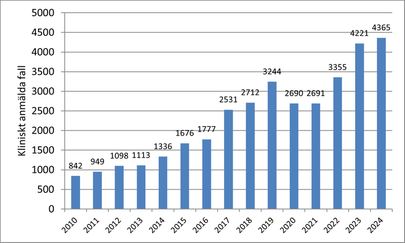 Statistik för antal fall av gonorré i Värmland samt i Sverige.