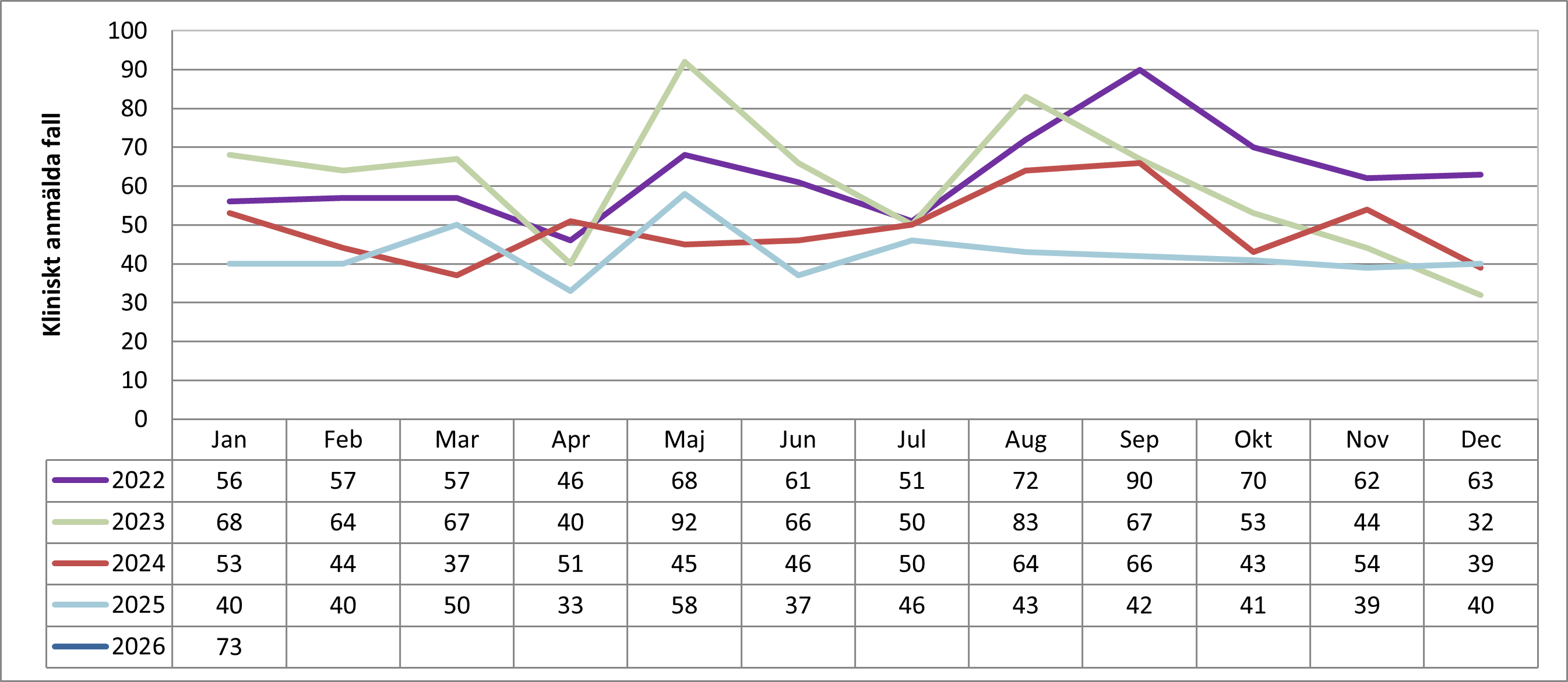 Antal fall av klamydia i Värmland per månad 2022-2026