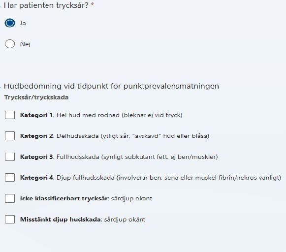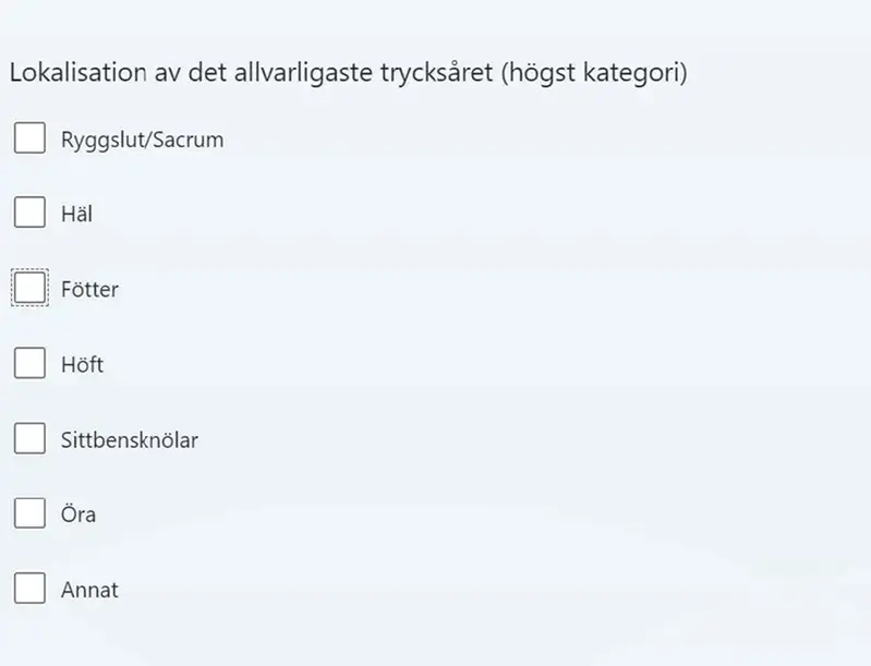 - Om patienten har trycksår, registrera vilken kategori såret tillhör (om patienten har fler än ett sår, välj flera alternativ).
