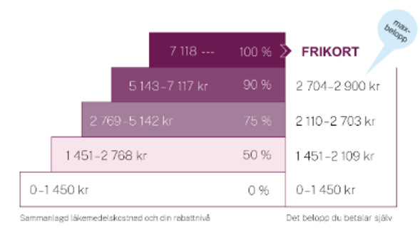 Figuren visar den nya högkostnadstrappan och de olika pris- och rabattnivåerna. Första rabatten infaller efter att patienten betalt 1 450 kronor. Därefter ökar rabatten i steg fram till frikort.