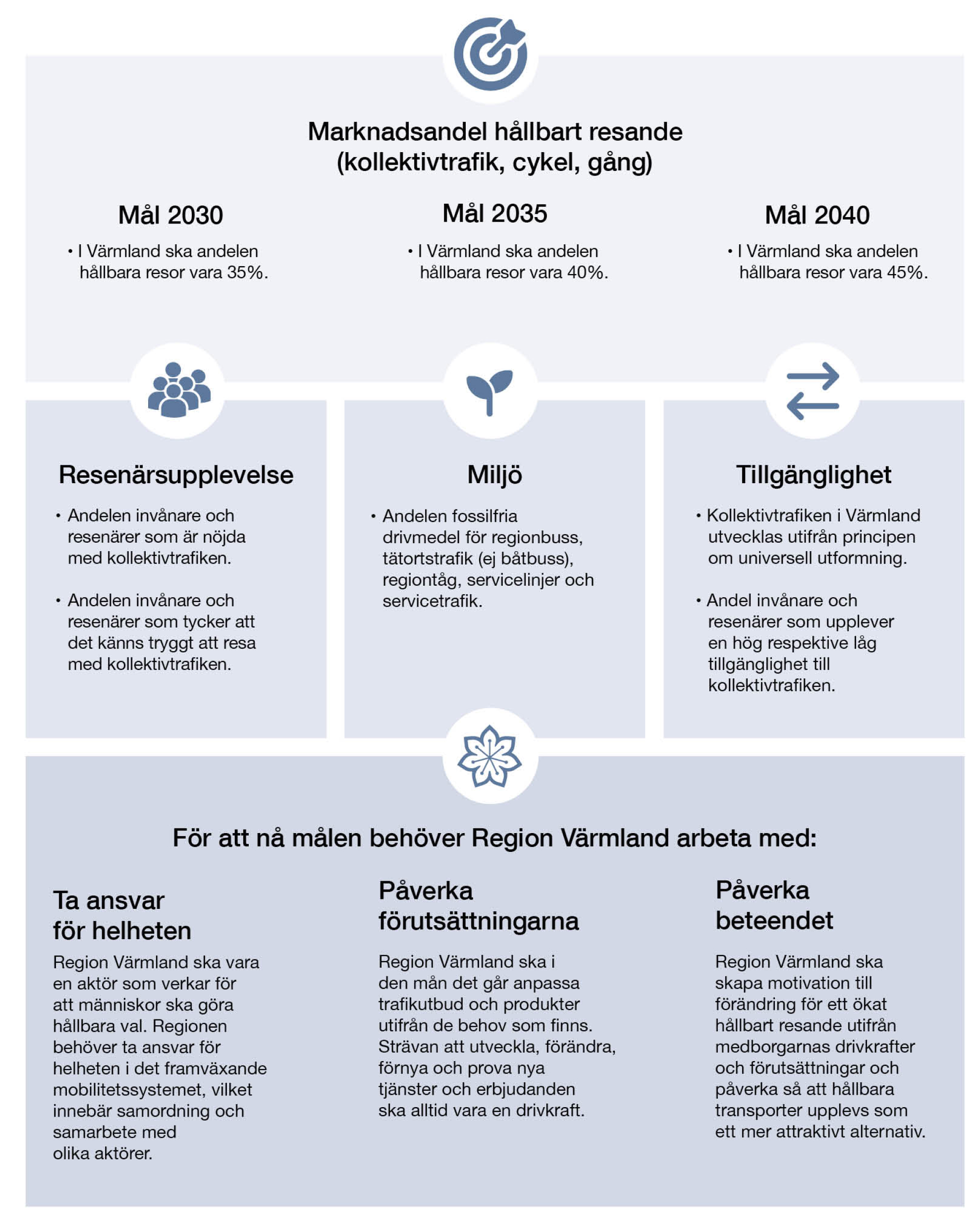 Det övergripande målet för den allmänna kollektivtrafiken i Värmland är att det hållbara resandet ska få en ökad marknadsandel av de regionala persontransporterna. Mål inom nöjdhet, trygghet, fossilfritt drivmedel och tillgänglighet bidrar till detta. I bilaga 1, kapitel 4, redovisas bakgrundsinformation för mål och indikatorer.