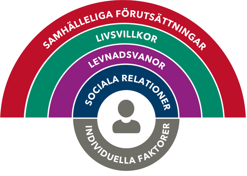 Samhälleliga förutsättningar, livsvillkor, levnadsvanor, sociala relationer och individuella faktorer är hälsans bestämningsfaktorer (baserad på Dahlgren och Whitehead, 1991).