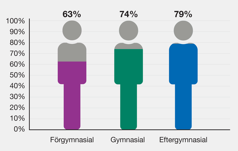 Grupper med hög utbildning har högst medellivslängd. Skillnaden mellan de olika grupperna har ökat de senaste 10 åren. Mellan år 2000 och 2019 ökade medellivslängden för grupper med förgymnasial utbildning med 1 år, för grupper med gymnasial utbildning med 2 år och för grupper med eftergymnasial utbildning ökade medellivslängden med 3 år. Källa: SCB.