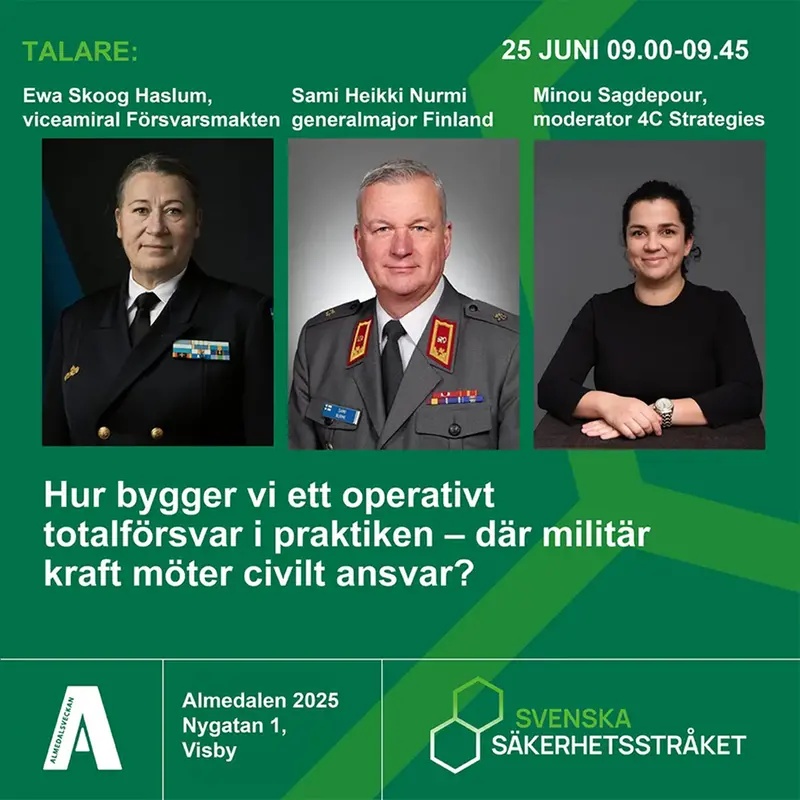 Den 25 juni samlas experter och beslutsfattare i Almedalen för Svenska Säkerhetsstråkets dag. Dagen samlar framstående företrädare från försvar, näringsliv, akademi och offentlig sektor för att belysa hur geografiskt förankrad samverkan kan omvandlas till konkret försvarsförmåga – i fred, kris och krig.