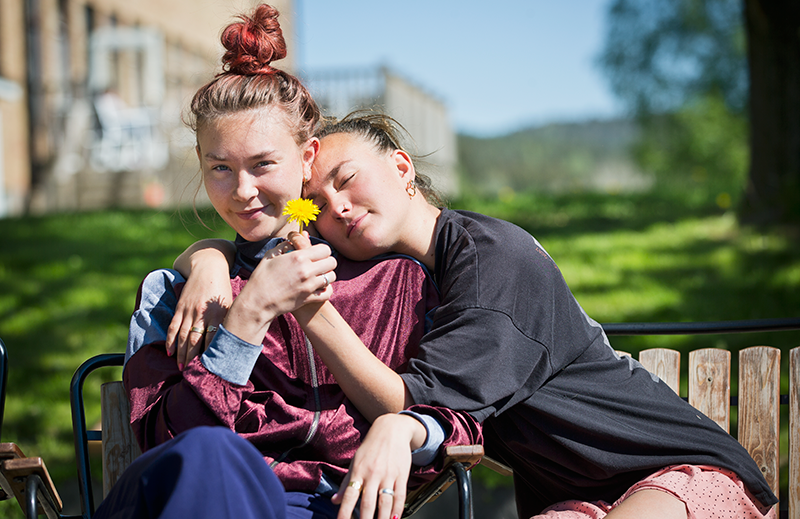 Två kursdeltagare en solig dag utanför skolan