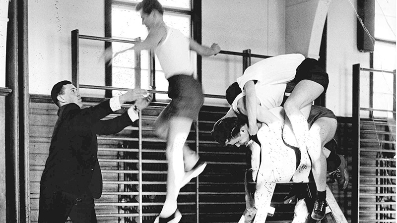 Kanske dåtidens framtida hälsotränare. Här hoppas det bock i skolans gymnastiksal.