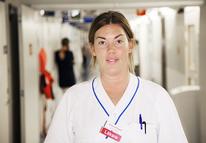 Rebecka Wästgård, som har tankar på att specialisera sig inom kardiologi eller anestesi, inledde AT-tjänstgöringen på medicinkliniken på Centralsjukhuset i Karlstad, samma enhet hon sommarjobbade på under studietiden. Personlig handledare och stora möjligheter till stöd både i patientkontakter och teoretisk återkoppling är viktiga inslag under AT-tjänstgöringen, menar Rebecka.