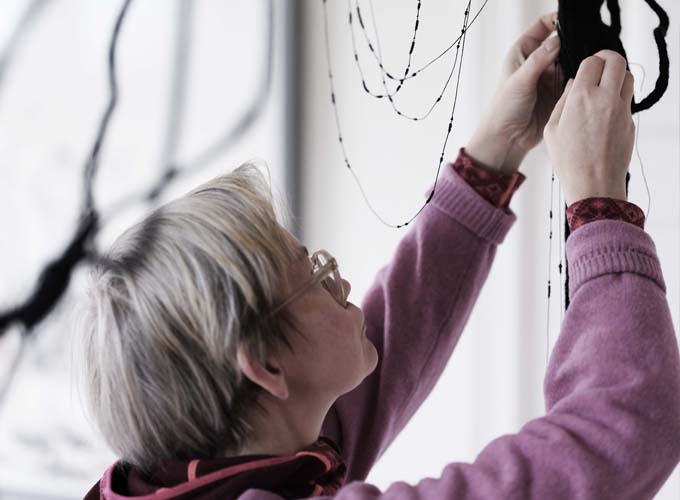 Mötet mellan tecknandet och den taktila textilen bildar grafiska former där två- och tredimensionalitet suddas ut. Hennes drivkraft i arbetet ligger i ett ständigt sökande efter nya sätt att uttrycka sina tankar. En ordlös kommunikation där textilen fungerar som en budbärare för lugn, trygghet och teckningen som kontrast till det, talar ett kraftfullt språk med sin svärta. Hon arbetar gärna rumsligt. Ett platsspecifikt verk ger möjligheter att integrera omgivningen, både rum och människa.