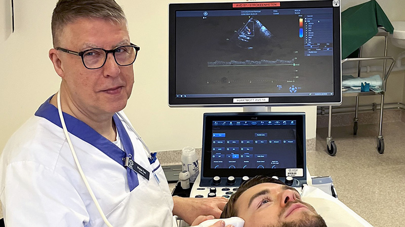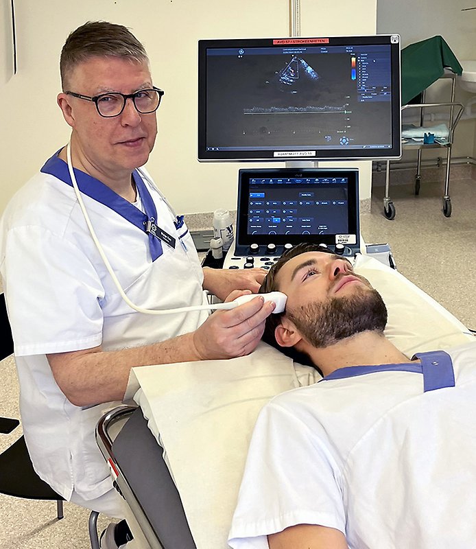 David Fresnais (undersöks med transkraniellt ultraljud i bilden) och Brynjar Fure (undersökare i bilden) - träning med transkraniellt ultraljud inför rekrytering av patienter till studie på minnesmottagningen, Centralsjukhuset Karlstad. Den aktuella studien som publicerades är en sammanställning av tidigare vetenskapliga publikationer inom området, med syfte att klargöra det samlade vetenskapliga underlaget för mätningar av hjärnans blodflöde med transkraniellt ultraljud hos personer med minnessjukdom.