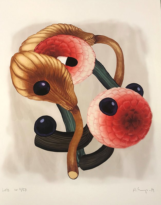 Månadens konstverk heter Lots från 2019 och är ett gicléeprint. Konstverket är ett av åtta konstverk med motiv av färgglada blommor, växter, mörka bollar och svartvita ögon i rörelse.