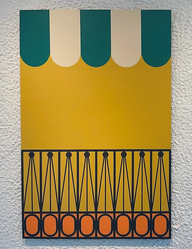 I målningen GOT 4.11 kan man se spår av gult tegel, koppardetaljer och balkongräcken. Detaljer som skapar en dialog och berättar om sin samtid.”