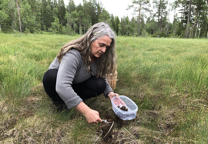 Ulrika Jäger, en av de värmländska deltagarna på residenset, gräver lera som efter att vatten har förångats och växtdelar har brunnit upp blir till pigmentfärgen rödockra. Se nedan.