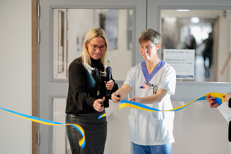 Åsa Johansson, regionstyrelsens ordförande, och Linda Hauge, verksamhetschef, klipper bandet vid invigningen av kirurgens nya lokaler på Centralsjukhuset.