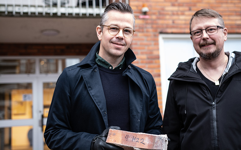 Jim Nilsson, projektchef för Regionfastigheter, och Daniel Olsson, produktionschef på Skanska, hoppas att teglet kan komma till användning igen.