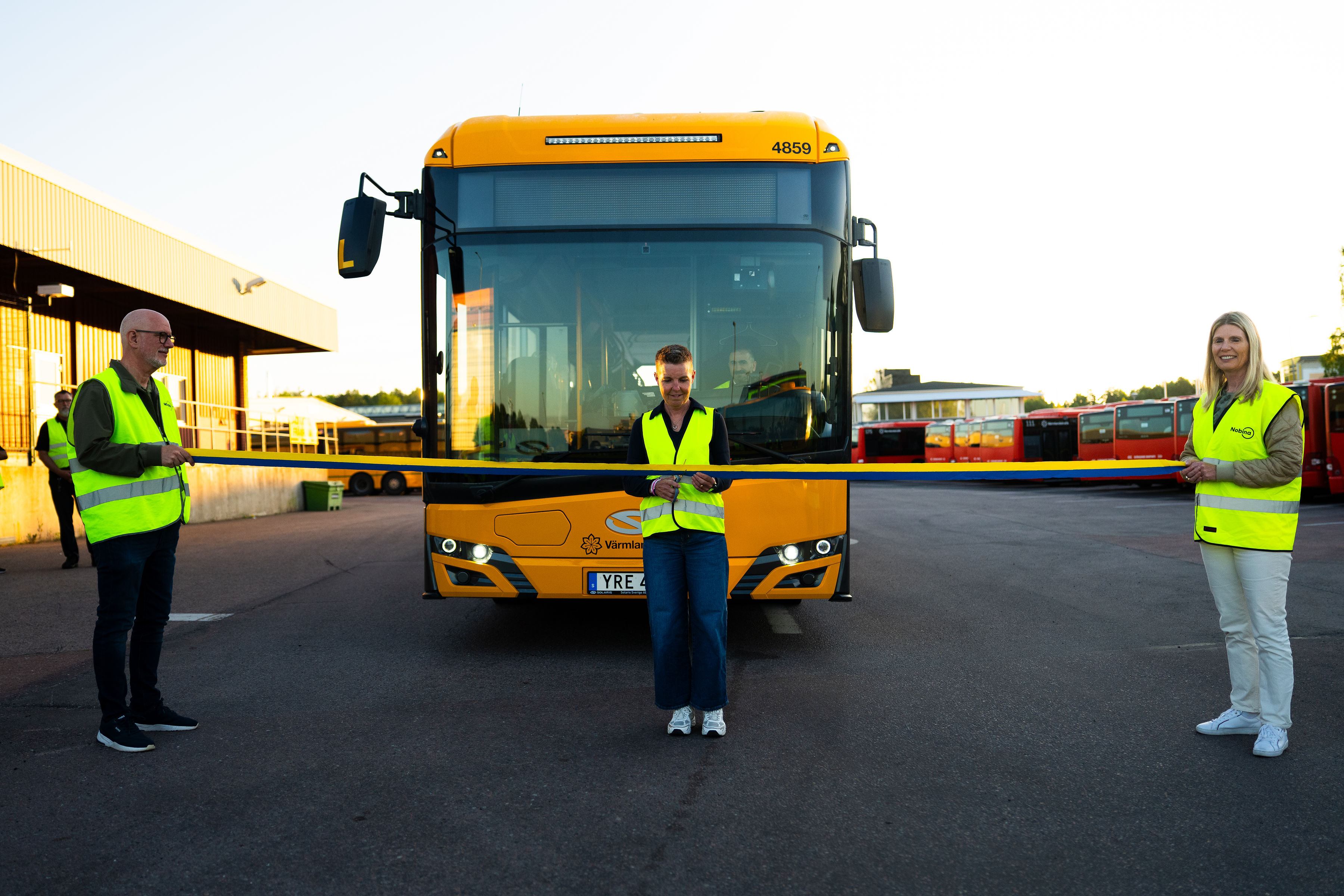 Strax före klockan 5 på tisdagsmorgonen invigde Nobina den första turen i Värmlandstrafiks stadstrafik i Karlstad. Åsa Andreasson, affärschef på Nobina Värmland, klipper bandet.