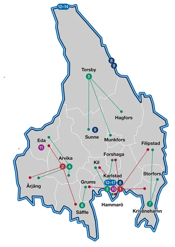 Kartan ger en lägesbild över olika typer av mobil vård i Värmland just nu och visar ett urval av befintliga team.