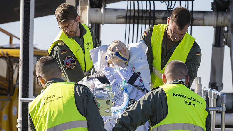 De fiktiva patienterna flögs in på riktigt från Norge, Tyskland och Nederländerna, till exempel med stora transportflygplanet TP 84 Hercules.