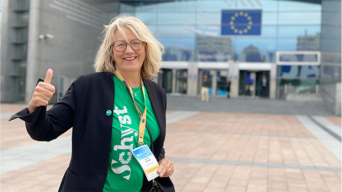 Katarina Nordmark, projektledare för Attraktionskraft Värmland, framför parlamentet i Bryssel.