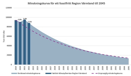 Region Värmland tog därför 2022 beslut om att bli en fossilfri välfärdsregion. År 2045 ska Region Värmland, som organisation, ge upphov till minst 85 procent lägre klimatpåverkande utsläpp jämfört med 2019. Målet gäller både direkt och indirekt verksamhet. Region Värmland har även ett delmål att användningen av fossila bränslen ska vara noll till 2030 i den egna verksamheten. Åtgärder för att nå målen ingår som en del i genomförandet av Region Värmlands Miljöplan 2021–2025.