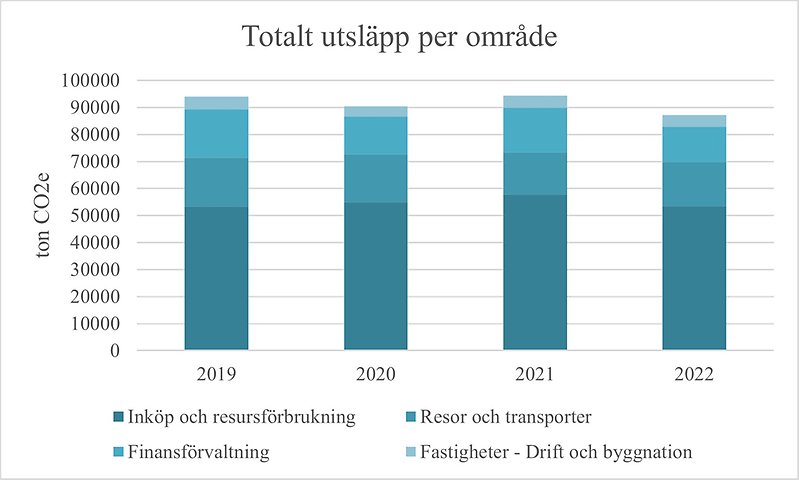 Inköp och resursförbrukning står för de största utsläppen och utgörs huvudsakligen av indirekta utsläpp. Även finansförvaltningens utsläpp är indirekta. Områdena resor och transporter samt fastighetsdrift och byggnation har däremot en mer blandning av direkta och indirekta utsläpp.