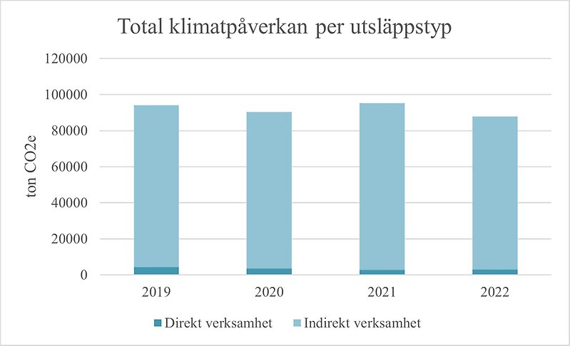 Klimatbokslutet visar att det totala klimatavtrycket minskar men inte tillräckligt snabbt för att ligga i linje med Parisavtalet. Indirekt verksamhet ger upphov till merparten av utsläppen och området inköp- och resursförbrukning står för omkring 60 procent av de totala utsläppen.