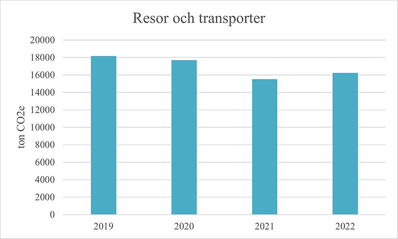 Klimatutsläppen från området resor och transporter har minskat med drygt 10 procent sedan 2019. Positivt är att fler kör elbil i tjänsten men också att inblandning av biodiesel har ökat. Positivt är också att fler har hittat tillbaka till det kollektiva resandet som ökade med 4 procent under 2022 jämfört med 2021.