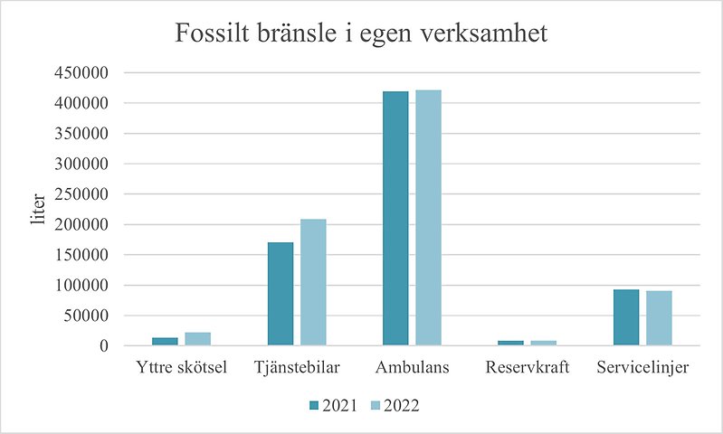 Klimatavtrycket för fossilt bränsle i egen verksamhet ökade med cirka 6 % 2022 jämfört med 2021. Målet är att ha nollutsläpp senast 2030. Ambulans, reservkraft och servicelinjer ligger relativt stilla medan tjänstebilarna och yttre skötsel ökade något.