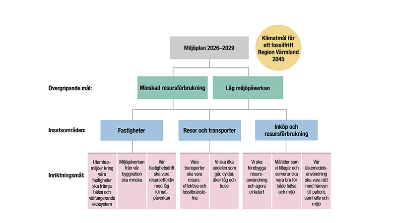 Under varje insatsområde finns det inriktningsmål och detaljerade mål till 2029. Målen i miljöplanen är framtagna för att bidra till uppfyllelse av organisationens klimatmål för Ett fossilfritt Region Värmland 2045.