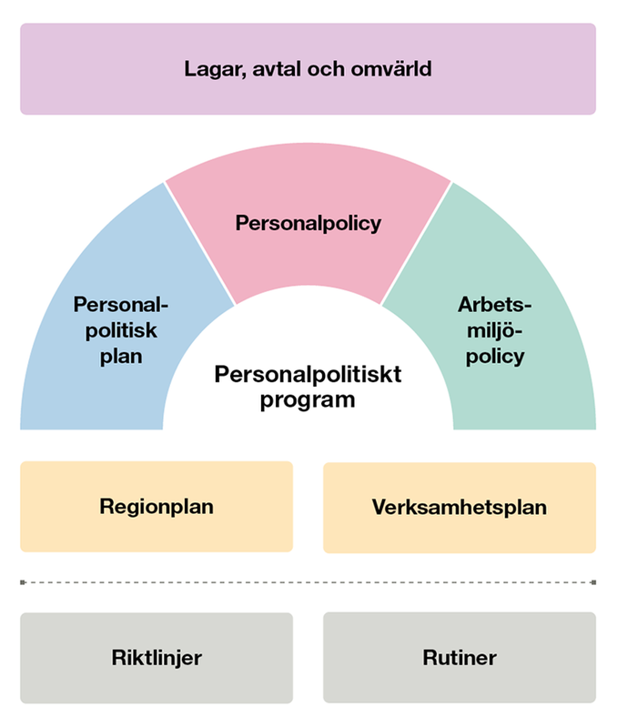 Modell över personalpolitiskt program. I programmet ingår personalpolitiskt plan, personalpolicy och arbetsmiljöpolicy.