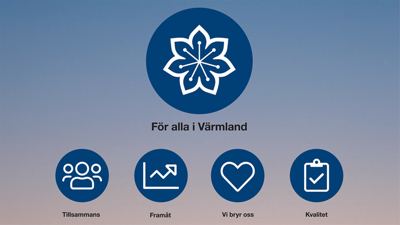 Region Värmlands värdegrund: För alla i Värmland. Fyra underrubriker: Tillsammans, Framåt, Vi bryr oss, Kvalitet.