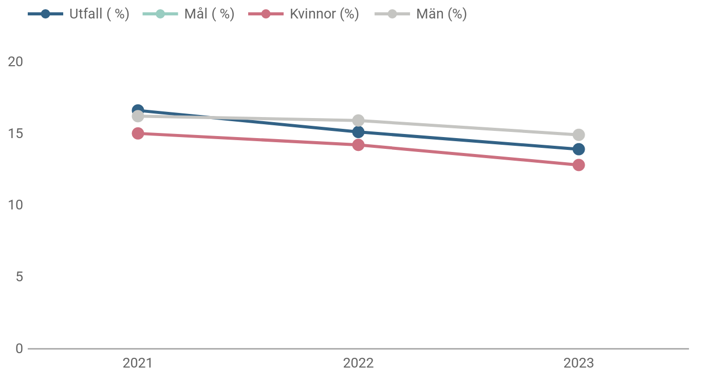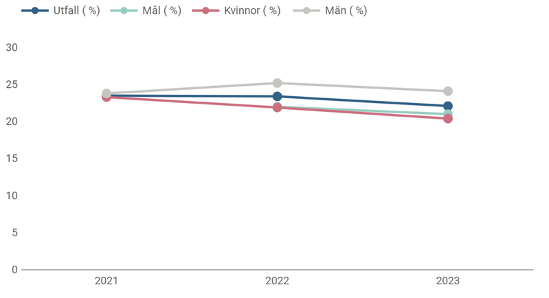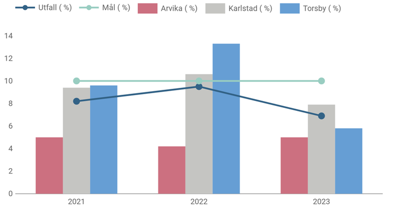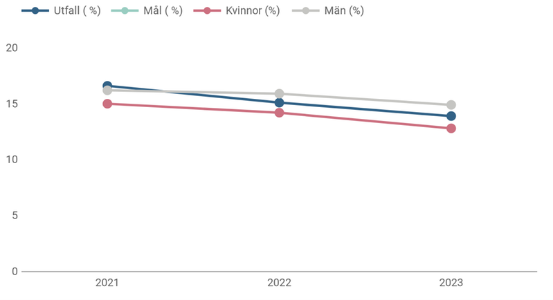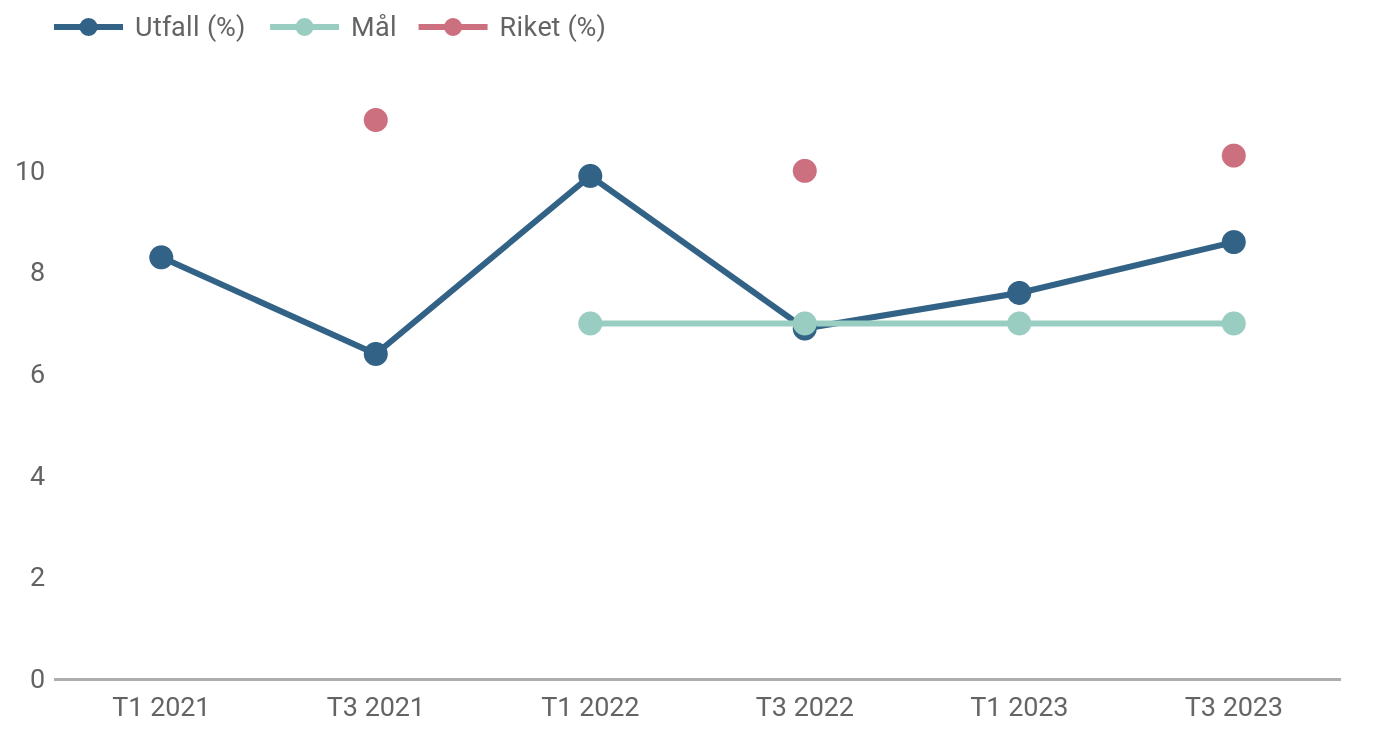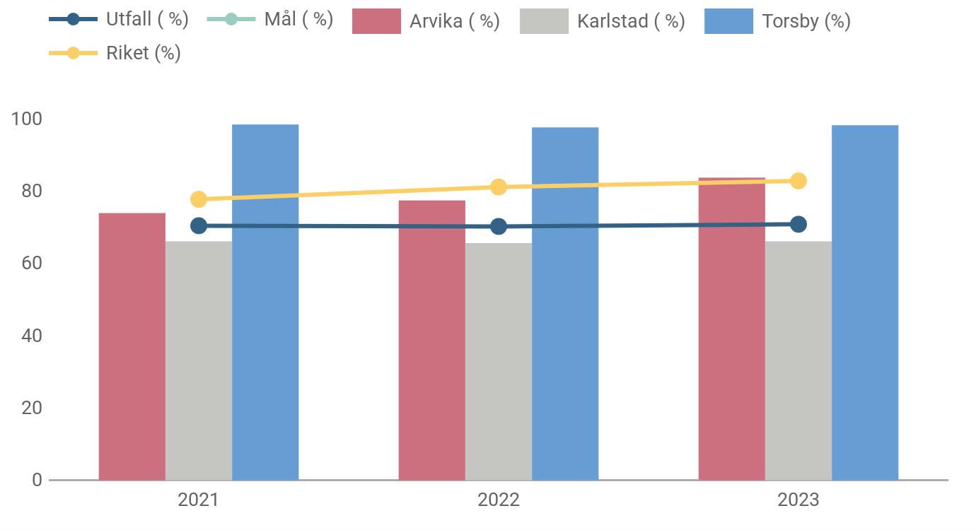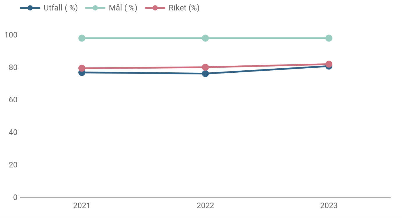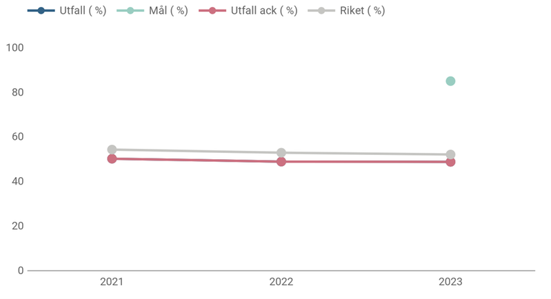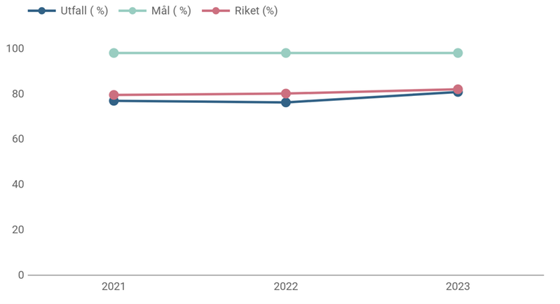 Under 2023 genomfördes samtliga tre riskbedömningar på 41,3 procent av patienterna som var 65 år eller äldre och vårdades inneliggande inom somatisk slutenvård. En ökning från 35,5 procent 2022, men når som inte upp till målvärdet över 50 procent. Andelen genomförda riskbedömningar varierar mellan olika verksamhetsområden, från 7 till 76,7 procent. Högst andel riskbedömningar utförs på närvårdsavdelningarna.
