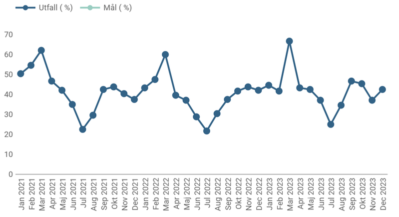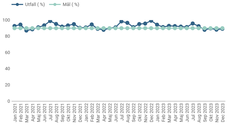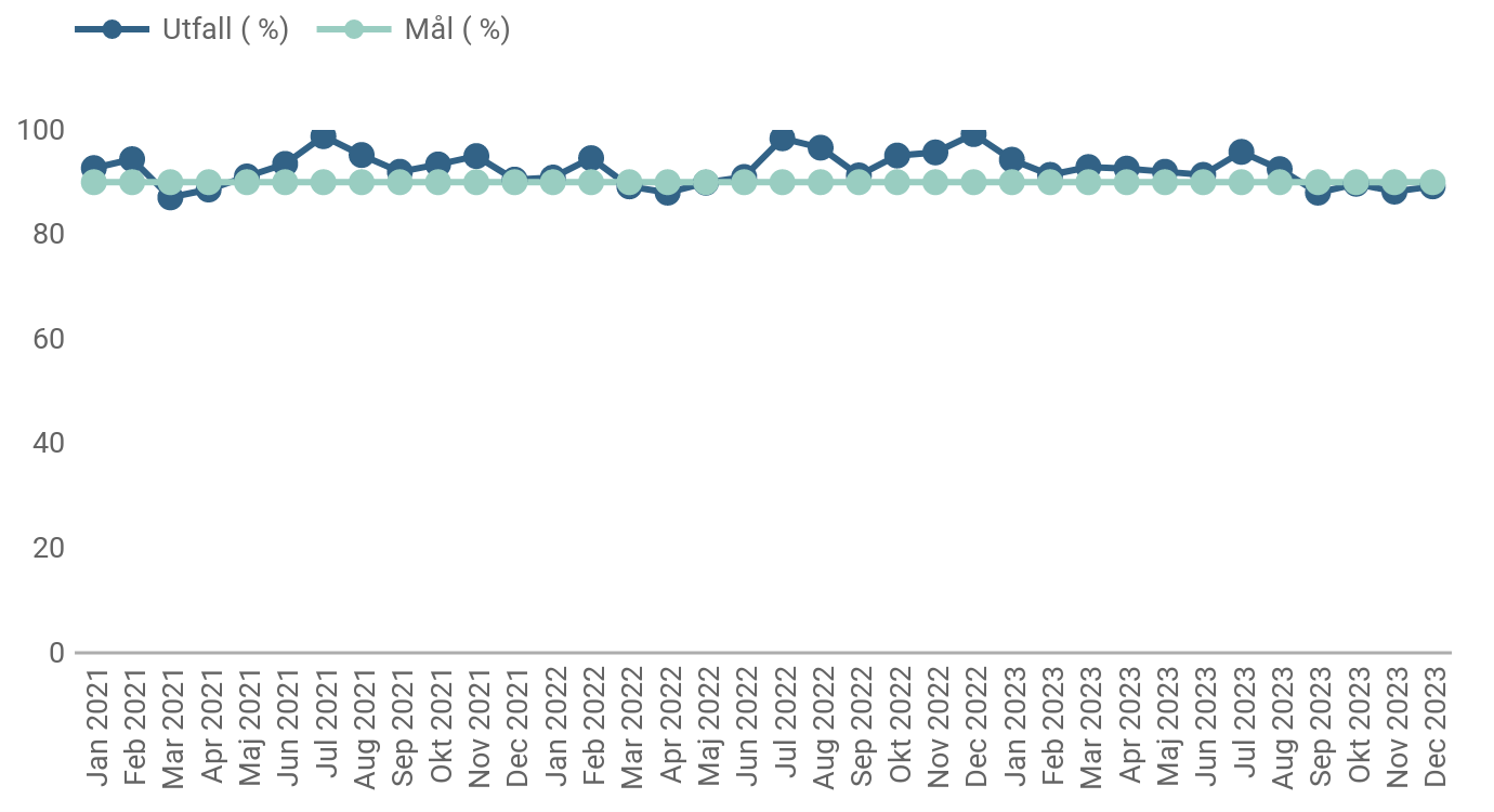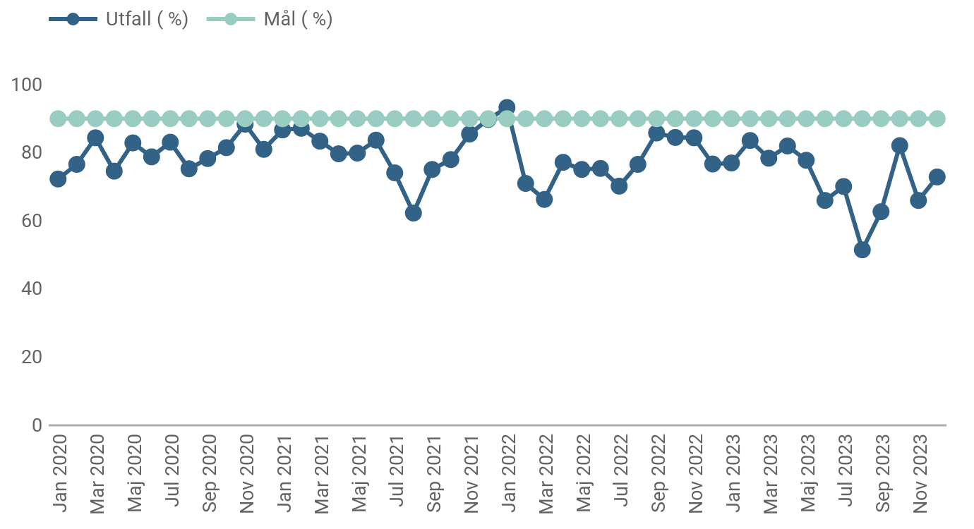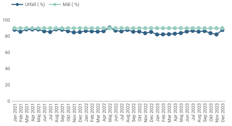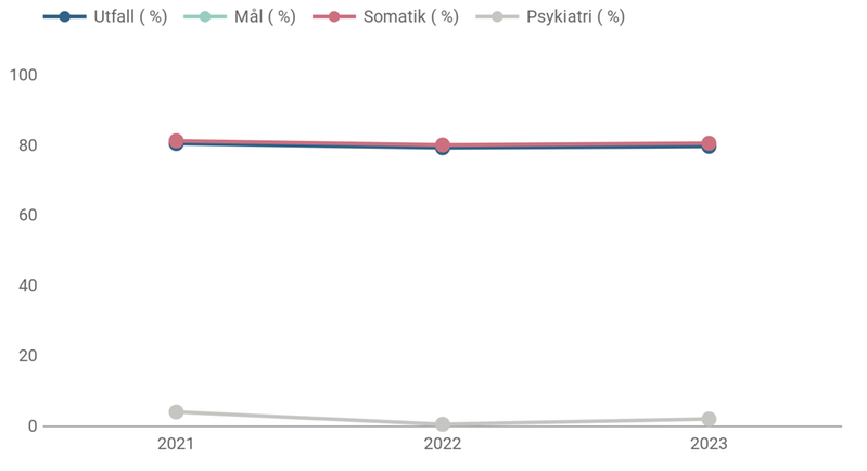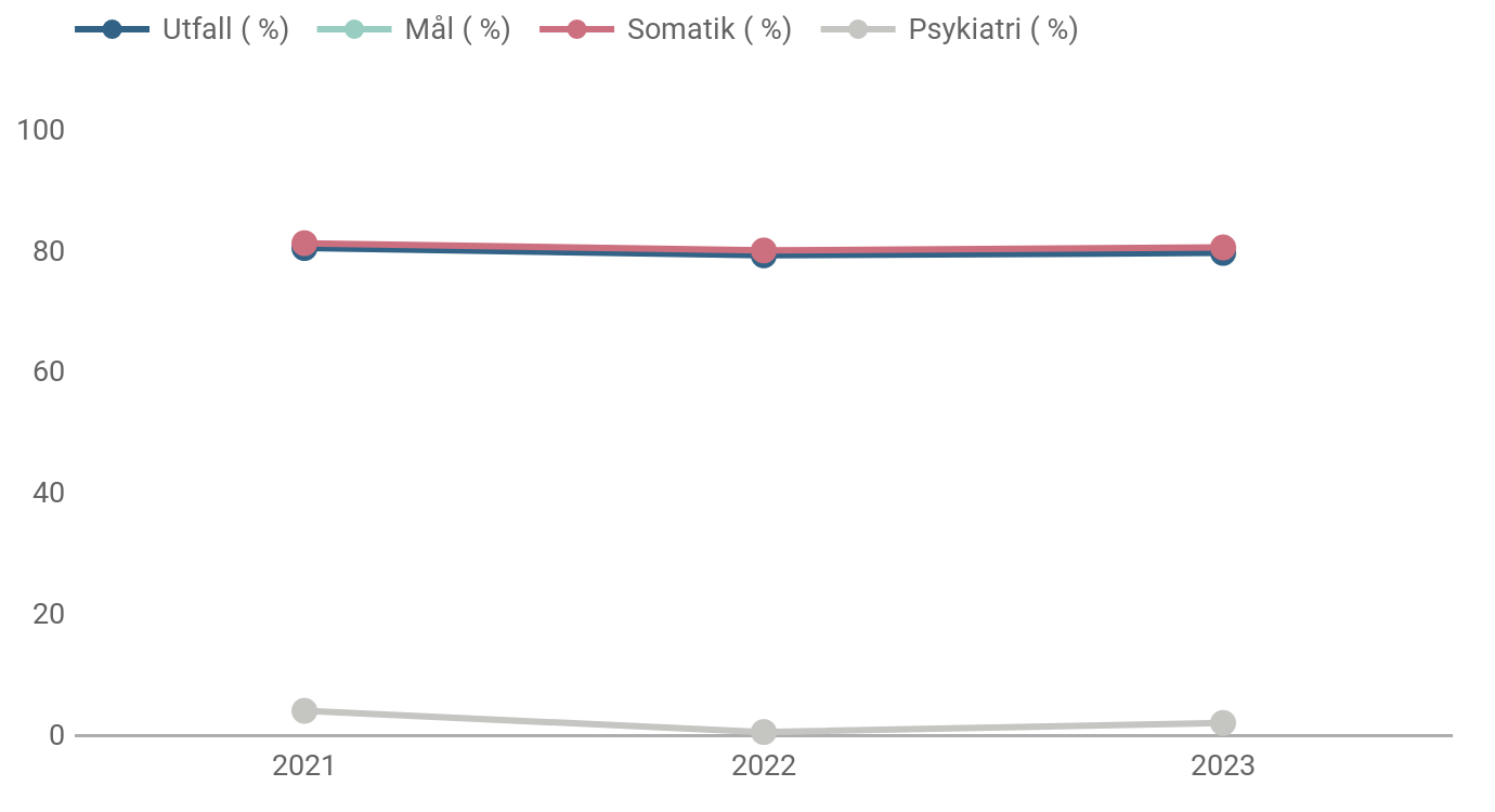 Under 2023 genomföres intensivt arbete för att förbättra vårdplatssituationen inom den somatiska specialiserade slutenvården och en standard utarbetades med ett överenskommet antal disponibla vårdplatser per vårdavdelning. Detta har medfört att det rapporterade antalet överbeläggningar per 100 disponibla vårdplatser har minskat under året och jämfört med föregående år. Resultatet är långt under rikets totala resultat.