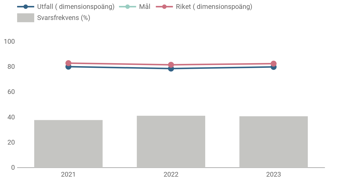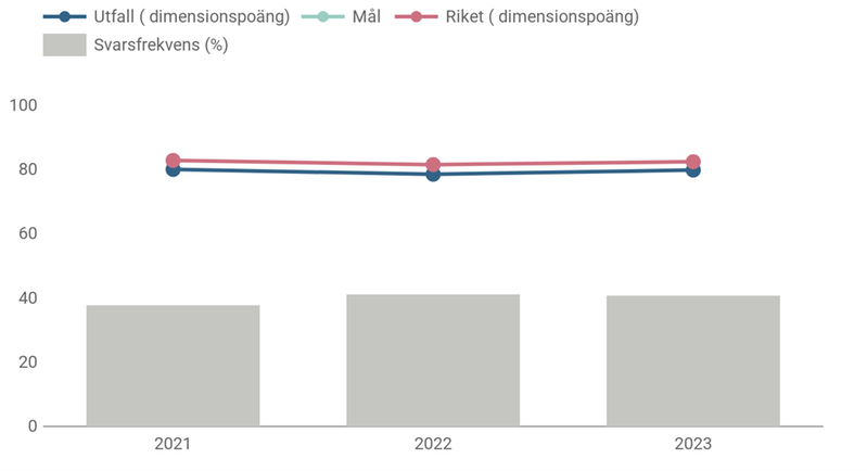 Totalt under 2023 var index/dimensionspoängen 84/100. Man kan se en variation på upplevelsen av delaktighet och involvering under 2023, där patienter inom specialiserad öppen- och slutenvård samt rehabilitering inom primärvård och öppen specialiserad sjukhusvård upplever hög delaktighet och involvering. Inom psykiatrisk slutenvård uppges låg delaktighet och involvering.
