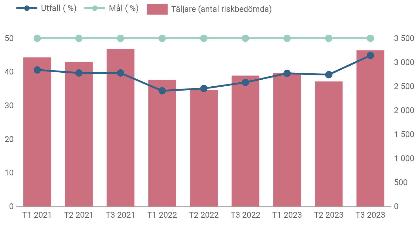 Något som påverkar resultatet är att utförda riskbedömningar inte alltid dokumenteras enligt rutin och kan därför inte fångas. I tillägg saknas det styrande dokument som beskriver att riskbedömningar ska genomföras. Det arbetas med en ny riktlinje som kommer innebära förändringar, och förhoppningsvis förenklingar, i dokumentationen. När detta är klart startas ett implementeringsarbete.