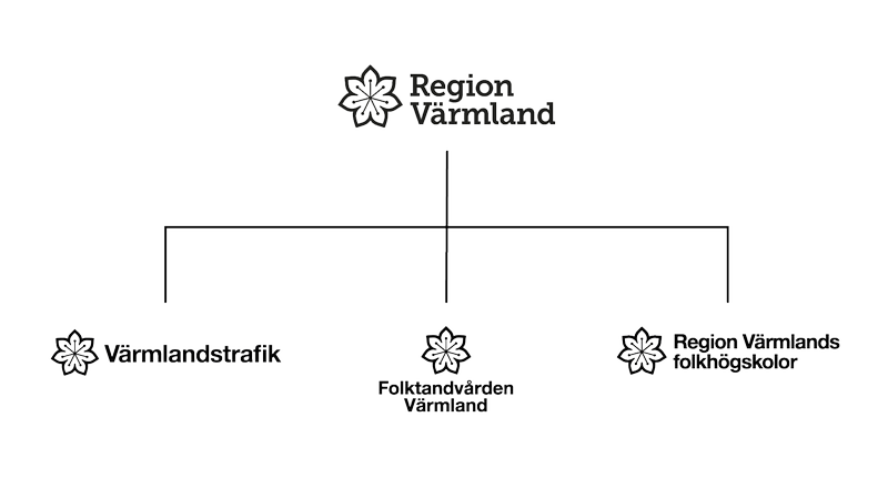 Vår varumärkeshierarki med Region Värmland som huvudvarumärke och tre undervarumärken; Värmlandstrafik, Folktandvården Värmland och Region Värmlands folkhögskolor.