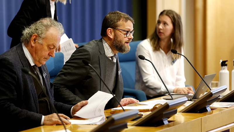 Tre personer vid skrivbord på podium