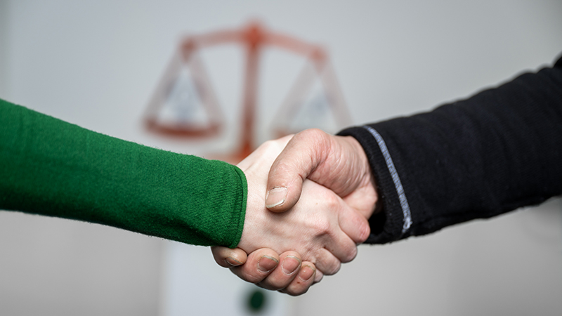 Ett handslag .En arm med grön ärm och en arm med blå ärm.