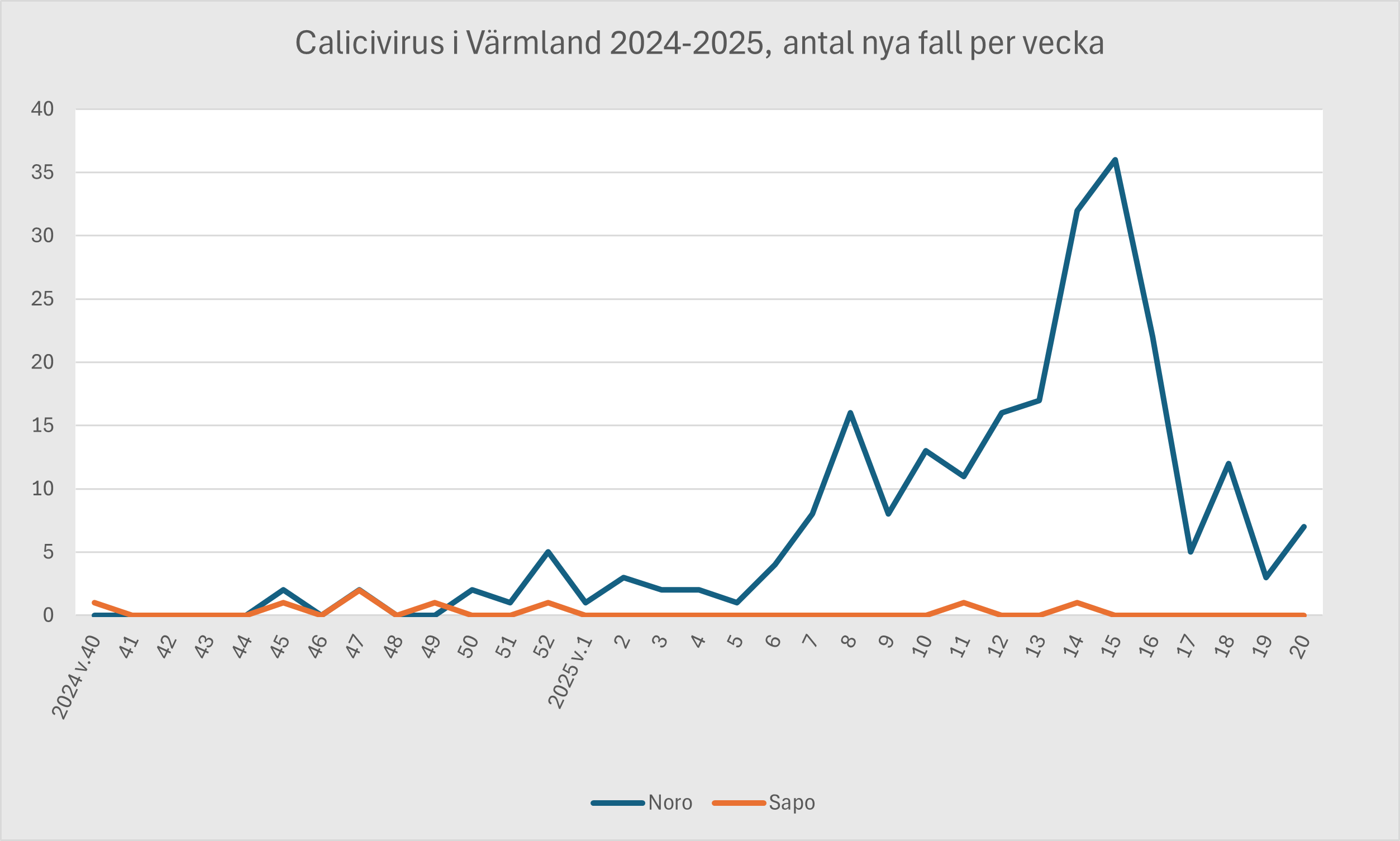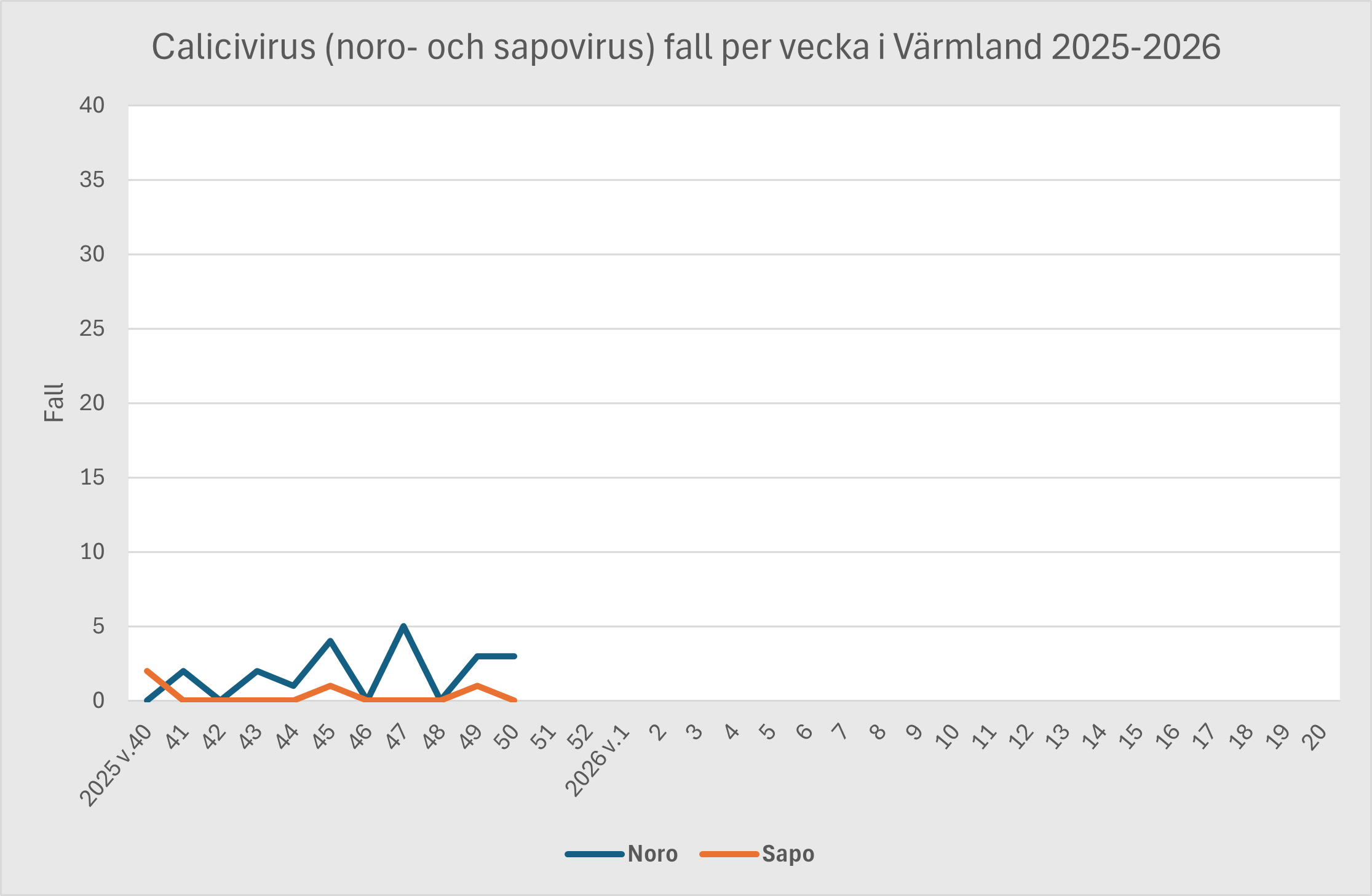 Antal fall av calicivirus (noro- och sapovirus) i Region Värmland per vecka under säsongen 2022-2023, 2023-2024, 2024-2025 och 2025-2026.