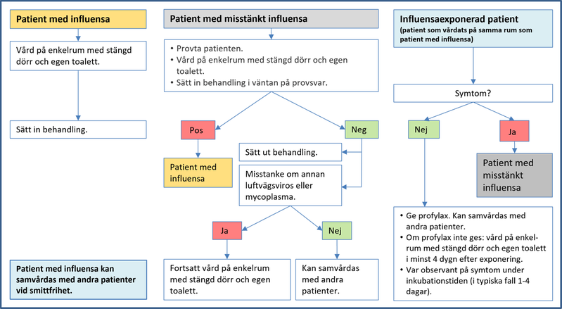Patient med misstänkt influensa ska isoleras på enkelrum med stängd dörr och ska inte vistas i allmänna utrymmen (väntrum/torg/korridor). Patient med kliniskt stark misstanke om influensa kan i väntan på provsvar flyttas från akutmottagningen till enkelrum på vårdavdelning. Behandling bör sättas in i väntan på provsvar vid misstanke om influensa, se plusbox ”Behandling och profylax”.