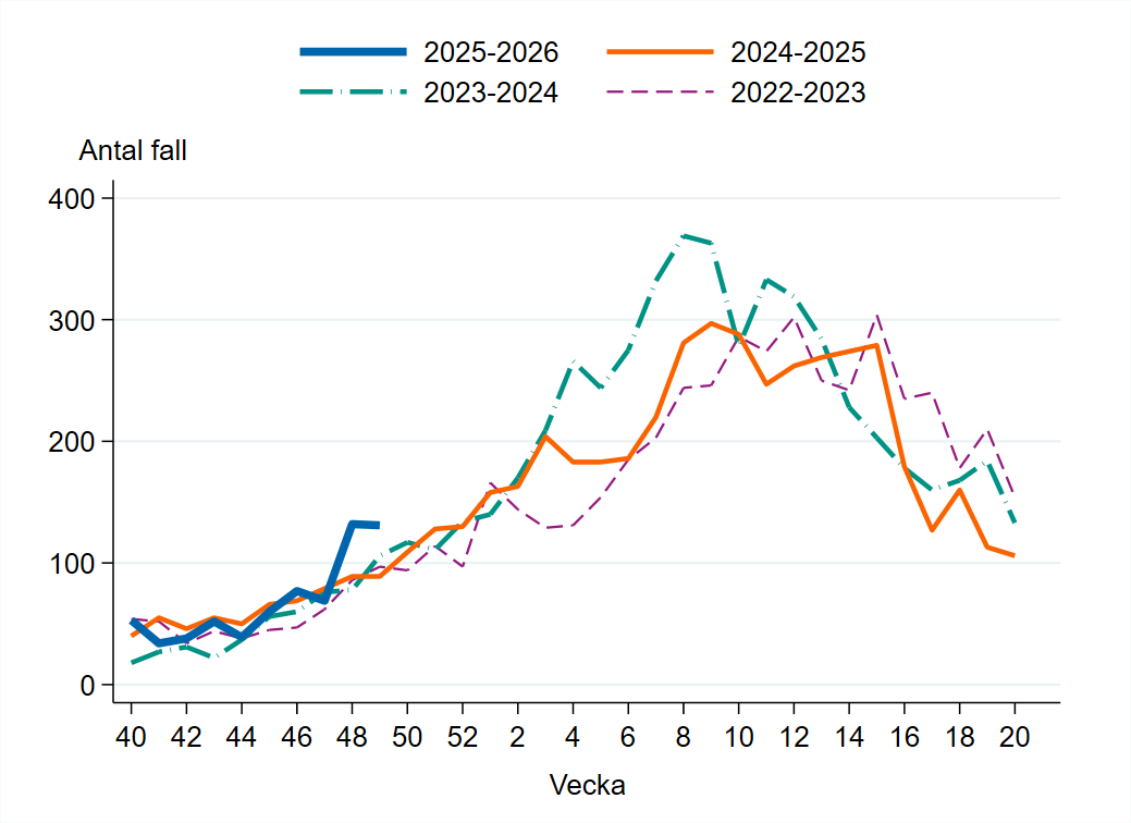 Antal fall av calicivirus (noro- och sapovirus) för Region Värmland per vecka säsongen 2022-2023, 2023-2024, 2024-2025 och 2025-2026.