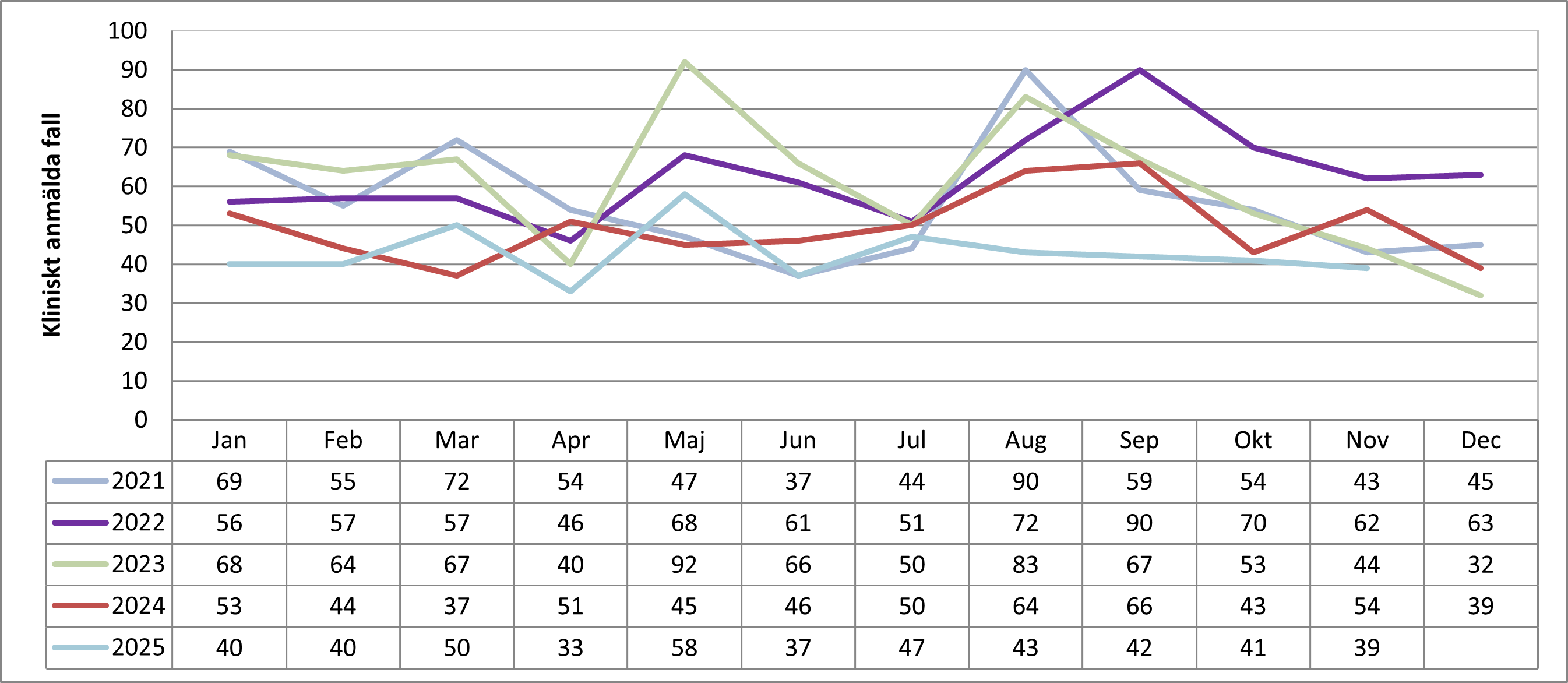 Antal fall av klamydia i Värmland per månad 2021-2025