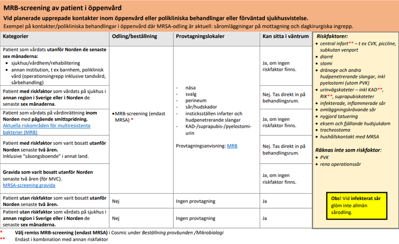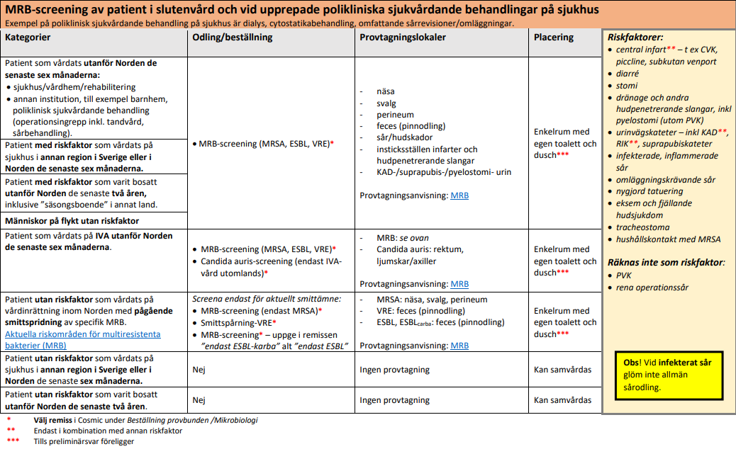 Matris för handläggning MRB-screening av patient i slutenvård och vid upprepade polikliniska sjukvårdande behandlingar på sjukhus.